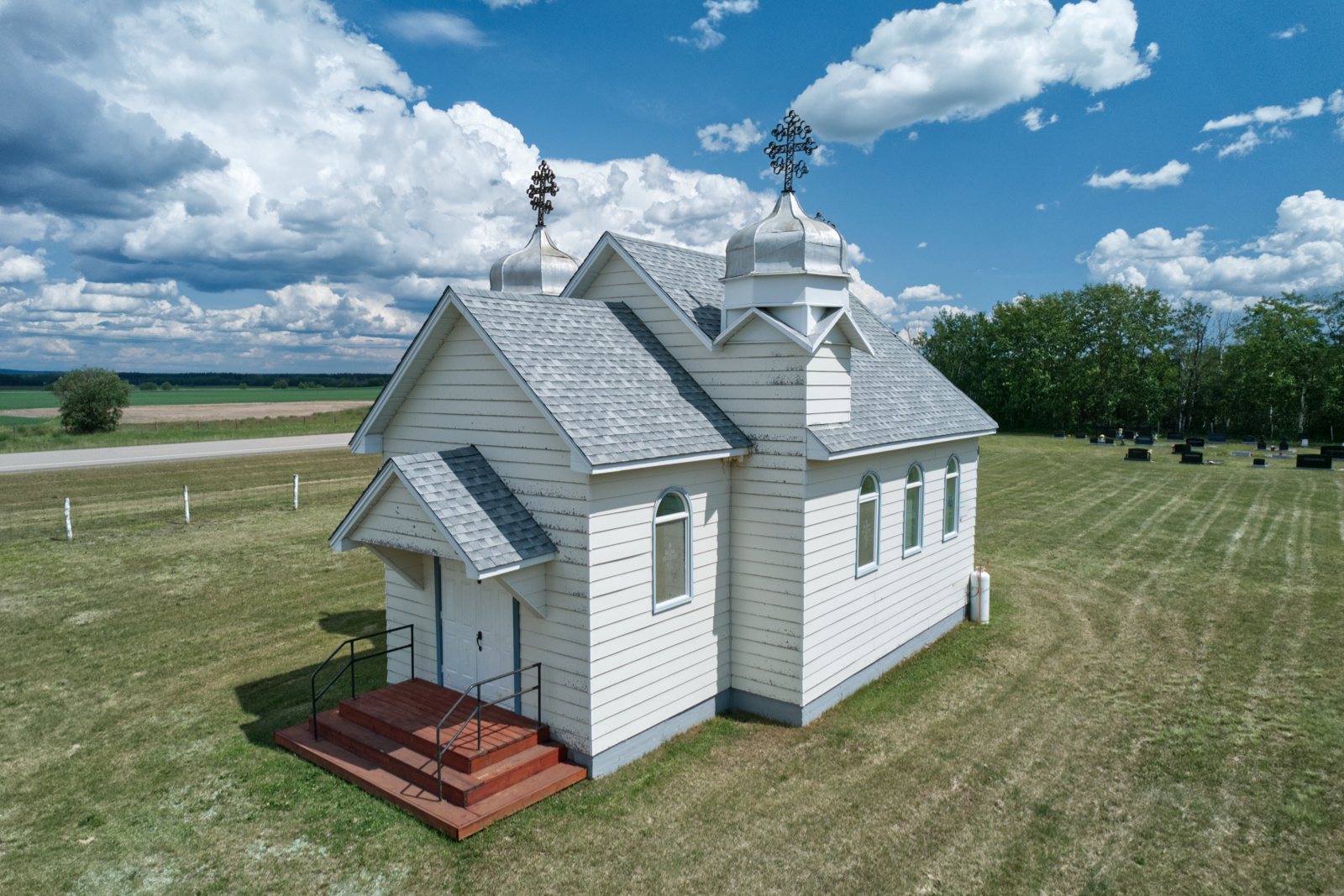 By 1948 the congregation was finally ready to undertake the construction of their church. Three hundred dollars was initially raised by the building committee to get started. Some 3,500 feet of lumber were donated by members for the structure – the design of which is said to have been modelled after churches that the local settlers remembered from the villages in their Ukrainian homeland. A man named Klym Martyniuk (who in 1933 had been the founding chairman of the Garth Ukrainian Evangelical Church) was hired as the carpenter to oversee the project at a dollar an hour. Helped by volunteers, his labour charges eventually totalled $1100. The rectangular shaped structure with a large vestibule was adorned with two flanking domes over the corners of the façade, and was completed without incurring any debts thanks to the successful fundraising efforts of the members. Meanwhile, in early 1949 the congregation wrote to the Consistory requesting that their feast day be changed from that of St. Mary the Protectress to All Saints Sunday.